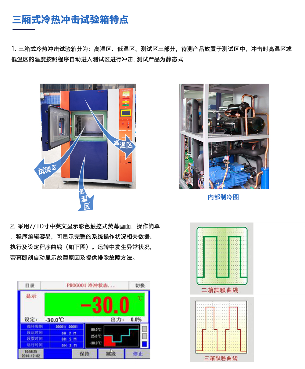 產品型號:JQTS3-408 品牌:劍 喬 用途:三箱式冷熱沖擊試驗箱又名溫度沖擊試驗或高低溫沖擊試驗是用于考核產品對周圍環境溫度急劇變化的適應性,裝備設計定型的鑒定試驗和批產階段的例行試驗中不可缺少的試驗,在有咨詢熱線:13829135130