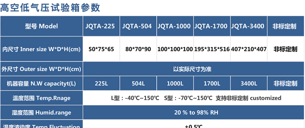 產品型號:JQTA-225 品牌:劍 喬 用途:高空低氣壓試驗箱主要用于試驗工件在低氣壓、高溫低溫、凝露、結霜單項或同時作用下的環境適應性與可靠性試驗,并或同時對試件通電進行電氣性能參數的測量。高空低氣壓試驗箱咨詢熱線:13829135130