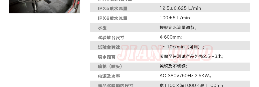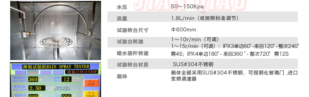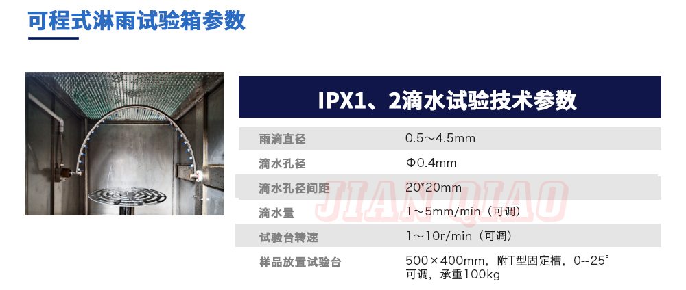 產品型號:IPX-1234 品牌:劍 喬 用途:可程式淋雨試驗箱適用于電工電子產品(包括組件)、燈具照明產品、汽車摩托車零部件外殼和密封件等產品做外殼防護等級測試(IP 防水等級試驗),模擬其產品在運輸和使用期間可能受咨詢熱線:13829135130
