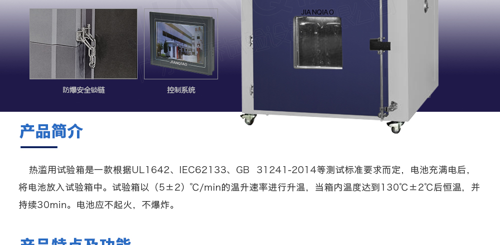 產品型號:JQ-101-512A 品牌:劍 喬 用途:熱濫用試驗箱是一款根據UL1642、IEC62133等測試標準要求而定,電池充滿電后,將電池放入試驗箱中。試驗箱以(5±2)℃/min的溫升速率進行升溫,當箱內溫度達到130℃±2℃后恒溫,并持續咨詢熱線:13829135130