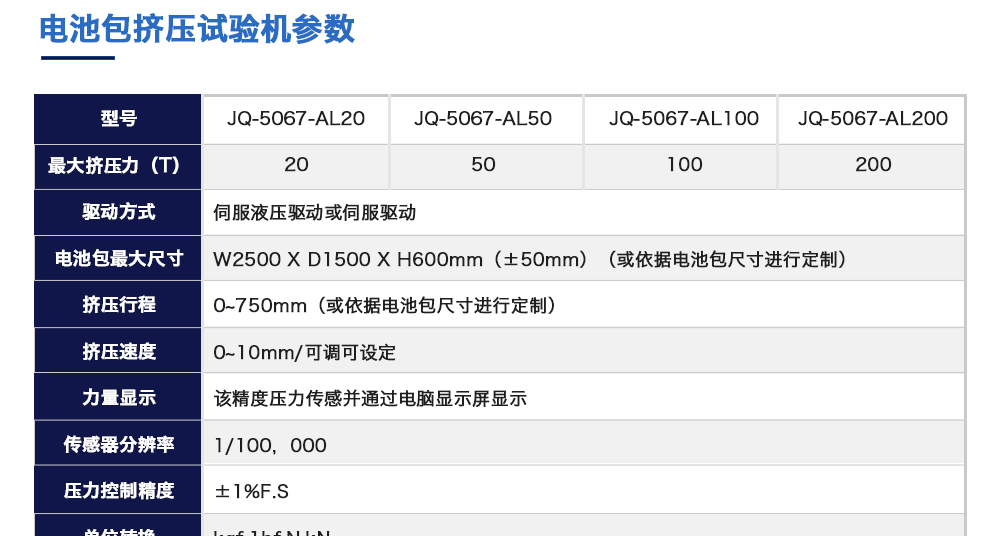 產(chǎn)品型號(hào):JQ-5067-AL20 品牌:劍 喬 用途:電池包擠壓試驗(yàn)機(jī)模擬各類(lèi)動(dòng)力動(dòng)力電池包和系統(tǒng)在運(yùn)輸、儲(chǔ)存及使用過(guò)程中電池包遭受碰撞擠壓的情形,人工呈現(xiàn)電池在遭受擠壓時(shí)可能出現(xiàn)的不同狀況。咨詢(xún)熱線(xiàn):13829135130