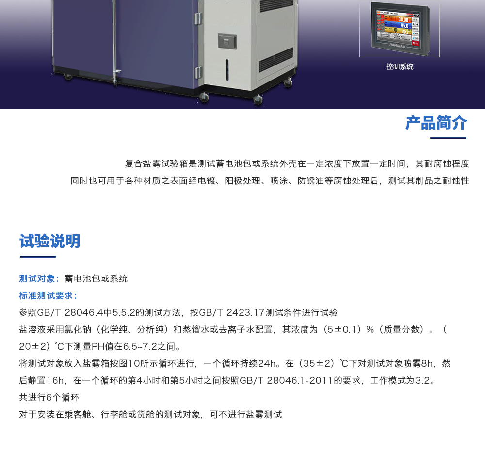 產(chǎn)品型號(hào):JQ-8209-12m3 品牌:劍 喬 用途:復(fù)合鹽霧試驗(yàn)箱是測(cè)試蓄電池包或系統(tǒng)外殼在一定濃度下放置一定時(shí)間,其耐腐蝕程度同時(shí)也可用于各種材質(zhì)之表面經(jīng)電鍍、陽(yáng)極處理、噴涂、防銹油等腐蝕處理后,測(cè)試其制品之耐蝕咨詢熱線:13829135130