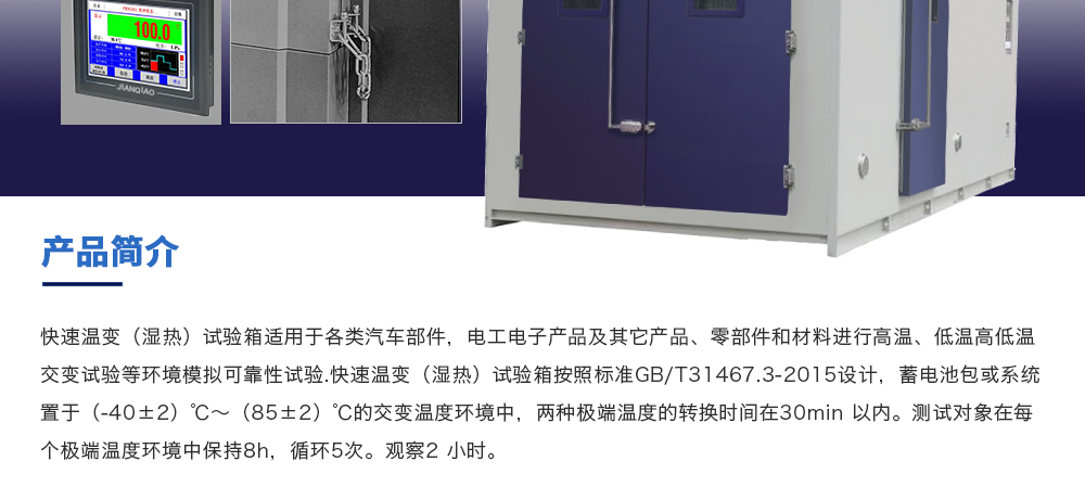 產(chǎn)品型號(hào):JQ-12㎡(定制款) 品牌:劍 喬 用途:快速溫變(濕熱)試驗(yàn)箱適用于各類汽車部件,電工電子產(chǎn)品及其它產(chǎn)品、零部件和材料進(jìn)行高溫、低溫高低溫交變試驗(yàn)等環(huán)境模擬可靠性試驗(yàn).快速溫變(濕熱)試驗(yàn)箱按照標(biāo)準(zhǔn)GB/T31咨詢熱線:13829135130