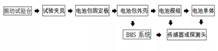 電池的振動試驗涉及到振動能量的傳播,這涉及到能量的傳播方向或路徑,試驗樣品安裝應符合GB/T2423.43的要求,如果樣品安裝方式不當,往往會改變振動能量的真實傳播,最終影響到試驗結果。電池振動試驗的能量傳播方向和路徑見圖2:振動能量傳播示意圖。