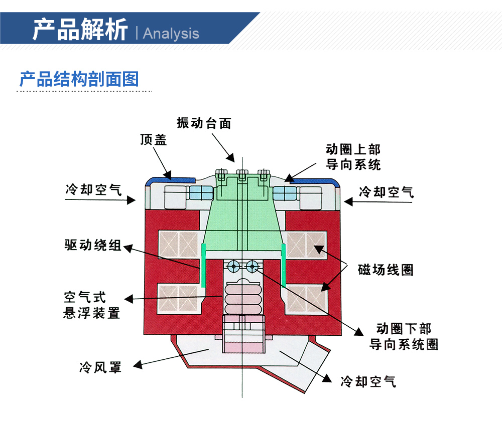 性能特點:●強制風冷 ●正弦激振力范圍: 1kN ~ 70kN●兩倍的正弦沖擊力(2噸以上可選三倍) ●輕質動圈,優化設計,耐振性能強●中心氣囊承載能力強,低頻性能好 ●可配置水平滑臺●風機冷卻效果好,噪音低 ●使用頻率可從1Hz開始●隨機與正弦激振力1:1 ●位移峰峰值最大可達100mm●耳軸氣囊隔震效果好 ●雙磁路設計,漏磁低,磁場均勻●正弦、隨機、沖擊等試驗功能 ●高效率、高可靠性功率放大器系統特點:◎一階共振頻率高、使用頻率寬優化的動圈骨架結構設計,特別是對傳統結構的動圈骨架傳力角板等薄弱環節進行增強設計,有效提高了傳力剛度;采用膠接與螺釘連接的復合固定繞線環筒和繞線環筒增強膠孔的新結構,增強了繞組的剛度。顯著提高了動圈的一階共振動頻率,超過了國際同類產品。◎動圈繞組可靠性高獨創的動圈繞組加強環的新結構和新工藝,顯著提高了動圈繞組工作在大推力、高加速度振動、沖擊和高溫環境中的耐振可靠性。◎風冷效率高創新的電動臺冷卻風道設計:改進了進風結構,上磁環用長槽型進風道取代圓孔型進風道;勵磁線圈采用蜂窩式風道、中磁環采用雙層風流式風道、下磁環采用斜楔型風道等新結構,顯著提高了冷卻效果。◎冷卻風機冷卻風機具有獨特的風道等結構設計,風機冷卻效果好,噪音低。◎水平和垂直試驗帶水平滑臺的電動振動臺可以用于水平和垂直試驗,兩個方向的切換方式簡單,翻轉方便。◎采用IGBT模塊功放采用性能可靠的MOSFET和IGBT模塊,具有很高的穩定性和可靠性。◎安全性能產品符合歐洲標準測試要求,在功放上裝有緊急停止開關,有效應對突發事件。符合美國UL和CE安全要求。**** 位移可選76mm或100mm.uDisplacement peak-to-peak value of 76mm or 100mm.
